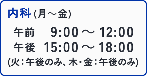 ※内科は基本「予約制」です。予約なしで直接ご来院された場合、当日の予約状況や診療内容によっては受診をお断りする場合がございます。ご来院前に、お電話にてご予約ください。