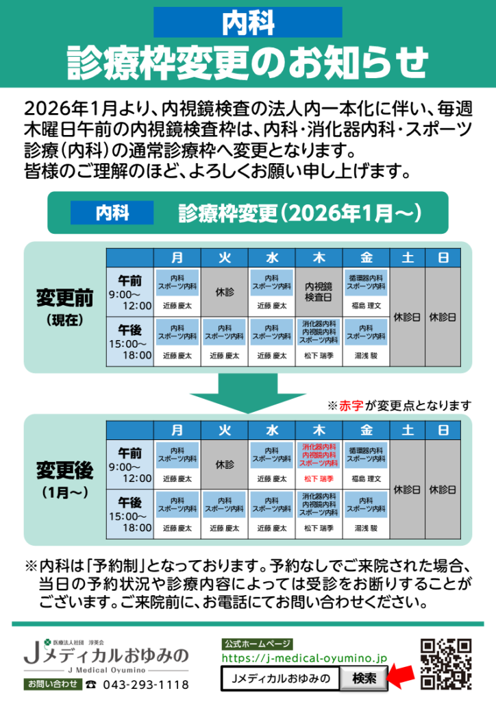 ≪内科≫診療枠変更のお知らせ【2026年1月~】