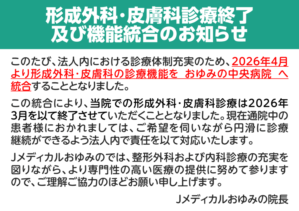 ≪形成外科・皮膚科≫ 形成外科・皮膚科診療終了及び機能統合のお知らせ