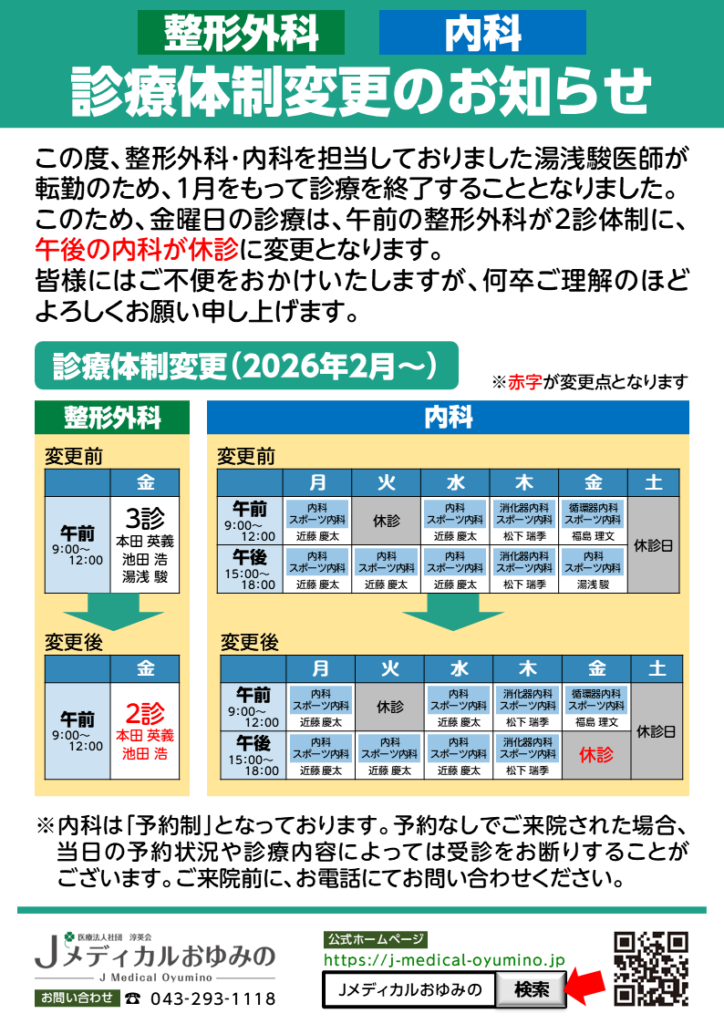 ≪整形外科・内科≫診療枠変更のお知らせ【2026年2月~】
